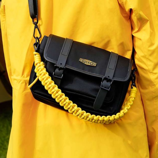 目を引く黄色の編み込みベルトが特徴的なデジカメバッグです。