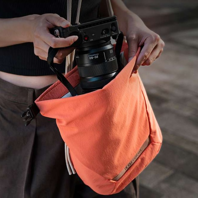 鮮やかなオレンジ色が目を引くこの巾着タイプのカメラバックは、ミラーレスカメラとレンズをコンパクトに収納できる優れものです。