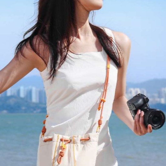 細めの革紐が肩への負担を軽減し、カメラ撮影時の動きやすさを実現