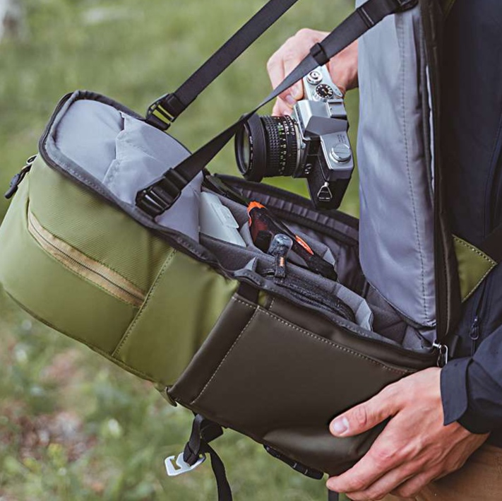 バッグの横からカメラを素早く取り出せる設計で、撮影チャンスを逃さない実用的な仕様